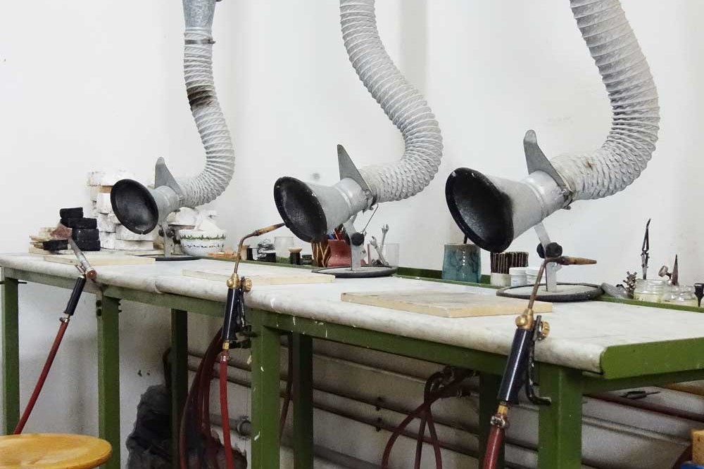 Additionally, acetylene-air soldering torches, an oxy-propane torch, and flex shafts are all available for student use. A pickling vat, drill press, buffing machine, bench grinder, bench shear, and anvil are all installed, as well.